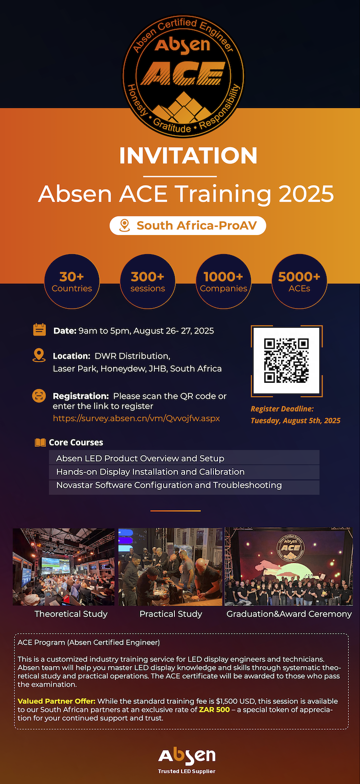 We are excited to invite the ProAV market to attend Absen ACE Training, taking place on 26 and 27 Augustfrom 9am to 5pm at our offices.