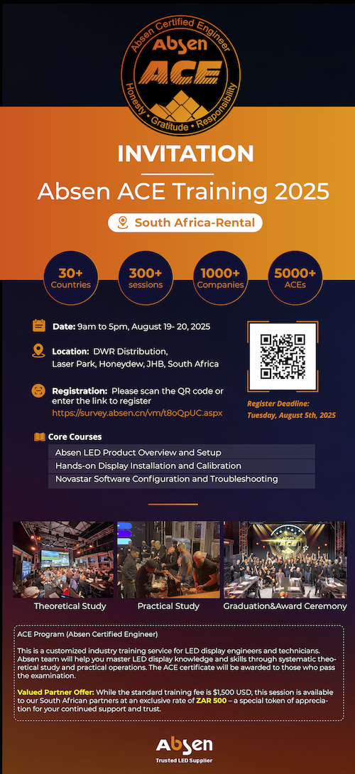 We are excited to invite the rental and staging market to attend Absen ACE Training, taking place on 19 and 20 August from 9am to 5pm at our offices.