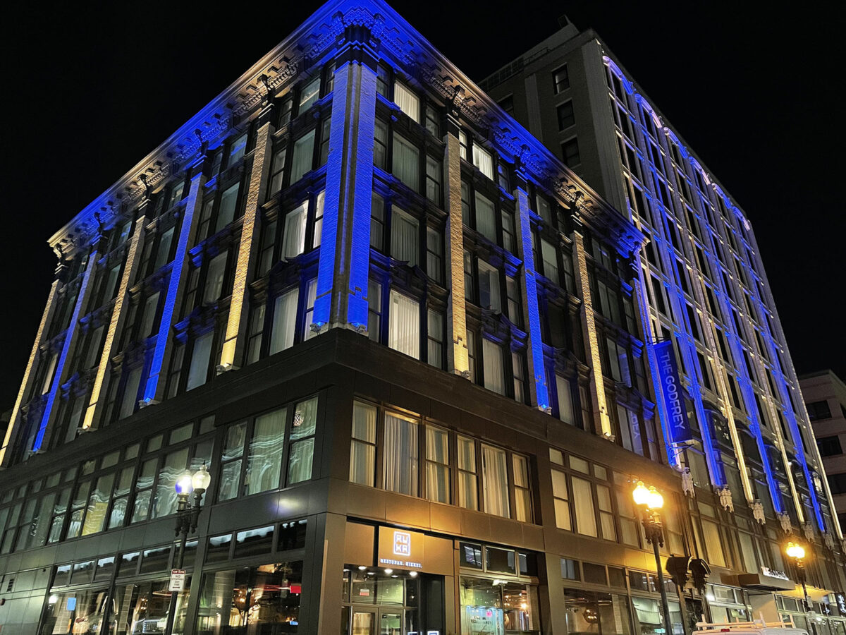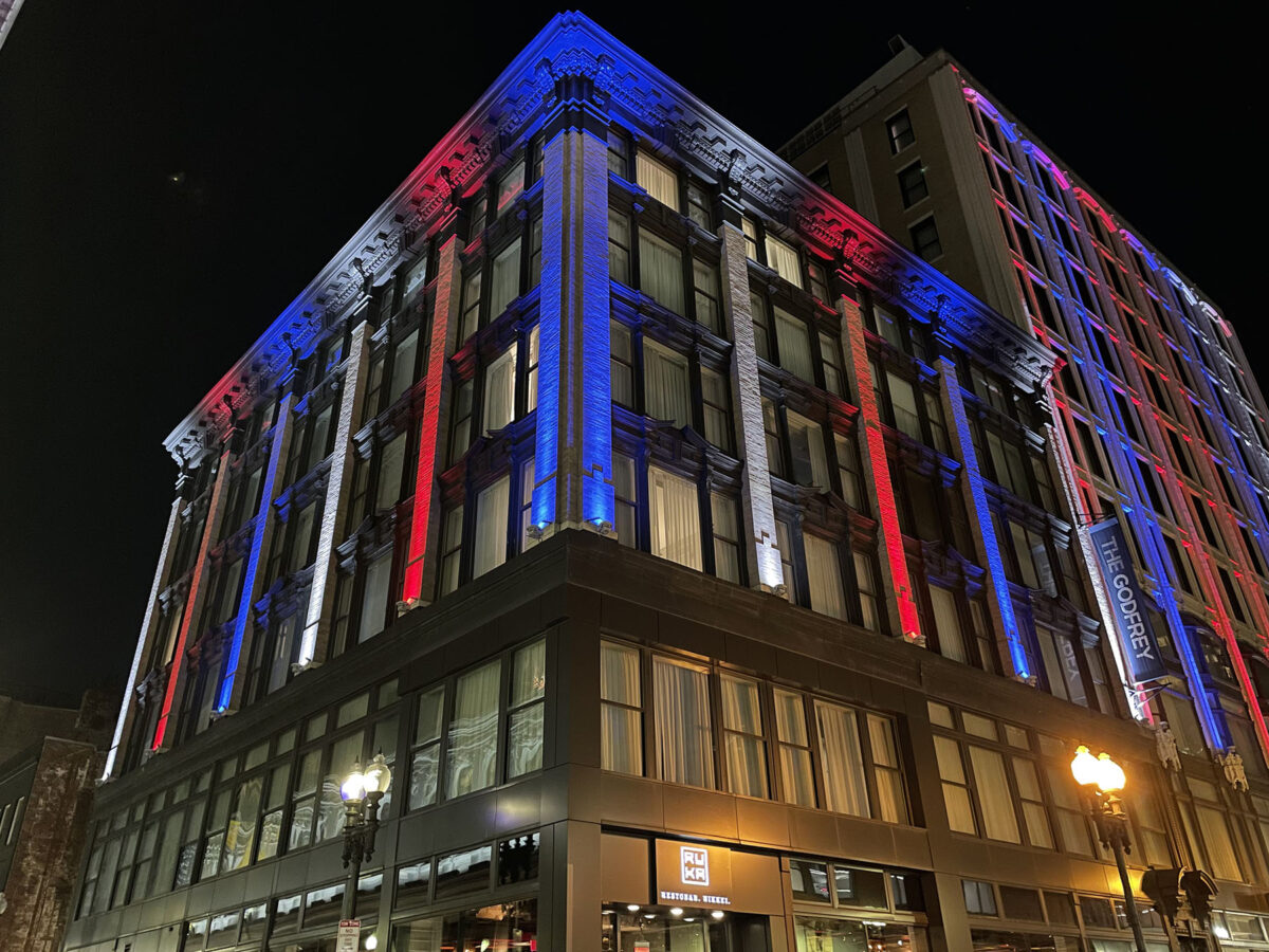 A spectacular new Anolis external lighting scheme is illuminating the facades of The Godfrey Hotel in Boston, picking out the detail and architectural intricacies of the impressive former Blake & Armory Building, a historic commercial site at the corner of Temple Place and Washington Street in the city’s Downtown Crossing pedestrian shopping zone.
