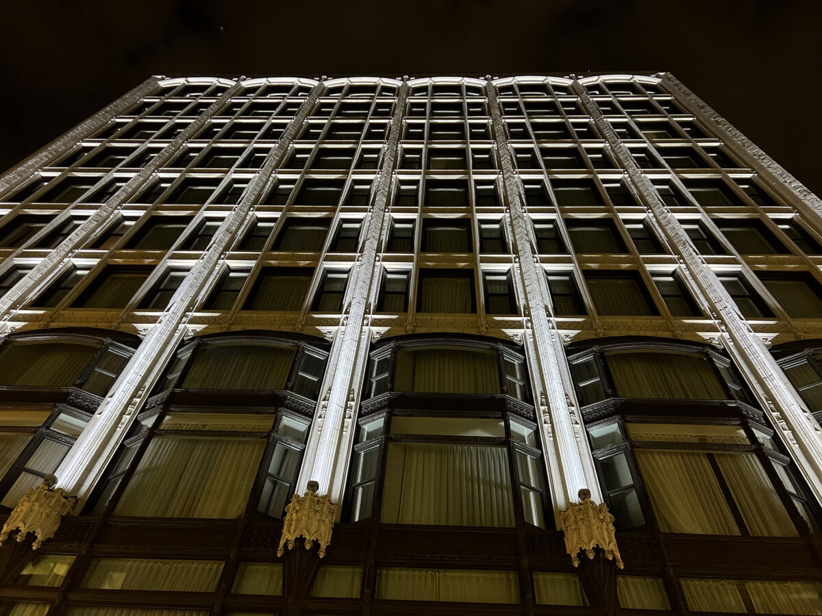The compact size and rounded shape blended in well with the overall building aesthetics and it offered excellent, even, high quality lighting coverage across the facades. The fixtures are located 20 feet up from pavement level where the old lights used to be, and where the architectural columns start that run up to the top of the building.