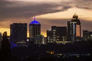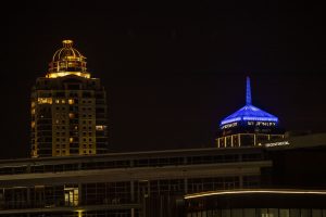 The ArcLine fixtures are located on and around the existing roof sections forming the base of the steel structure which is supporting the cap’s metal flats. They evenly wash these fasciae as they rise above the ‘Sandton City Tower’ sign.