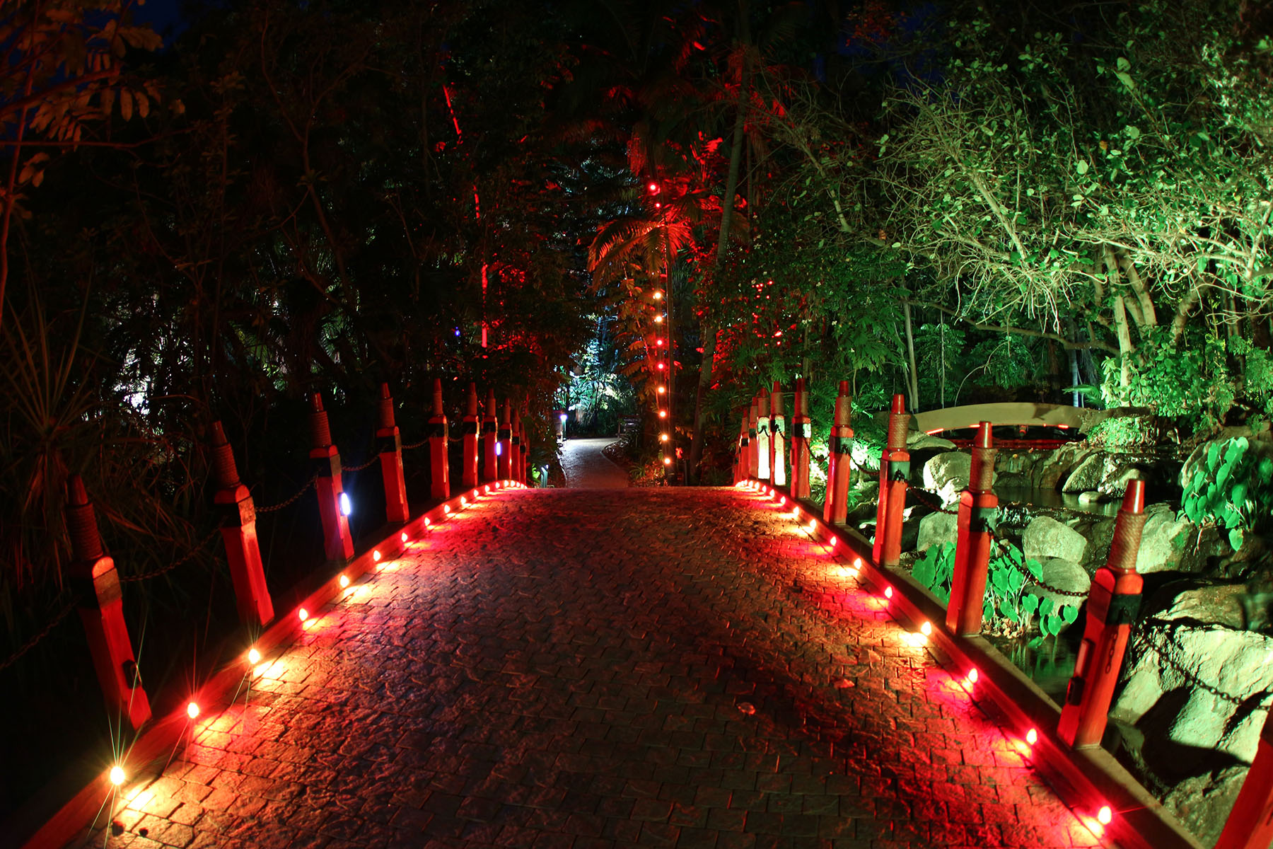 The ArcPix are at ground level on the bridge, cross lighting and texturing the cobbled floor. They are programmed to chase across that bridge and shoot up into the palm trees at the end, an energising kinetic effect which adds excitement and ramps up the vibe, adding a sense of anticipation and playfulness.