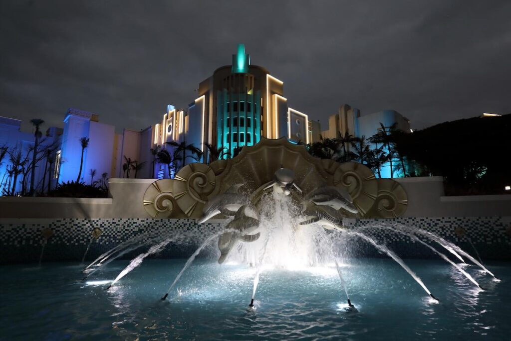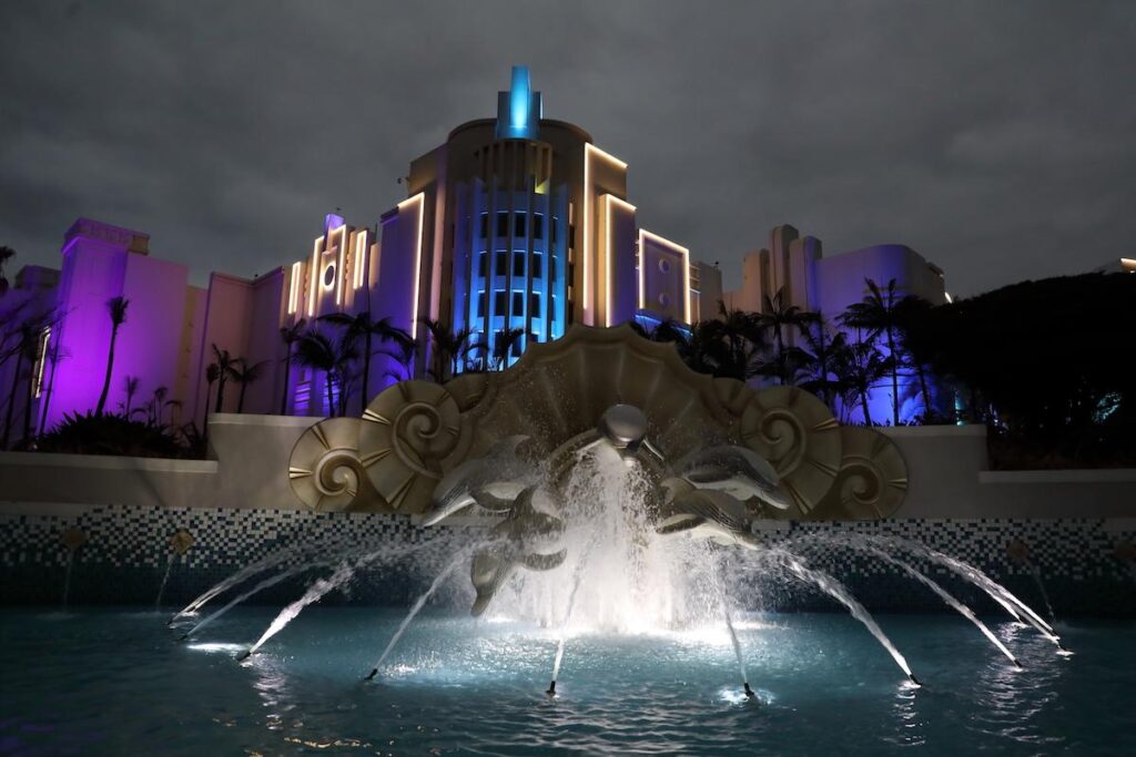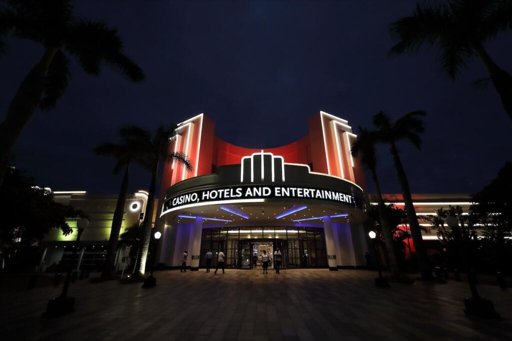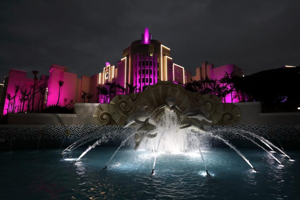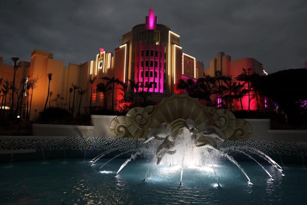 The casino used to be lit in multiple pastel colours in typical ‘Miami Deco’ style, so architect Brent Buchanan from NSIKA decided to refresh the entire building by painting it white to tie it into a new, more contemporary retail and theatre complex, complete with an enlarged casino development.