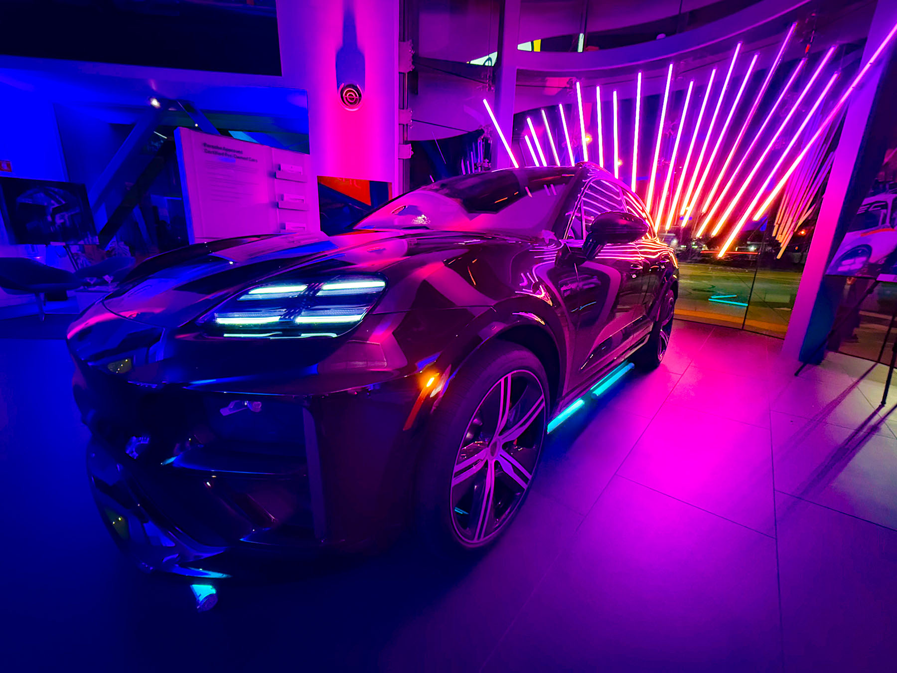 Sean Shay, creative director at Sound Image, a Clair Global Brand, reached for Astera Hyperion and Titan Tubes to help imagine a spectacular and dramatic piece of light art highlighting a ‘hero car’ for the launch of the Porsche Macan Electric car presented by Porsche San Francisco at their showroom in the city’s downtown Design District.