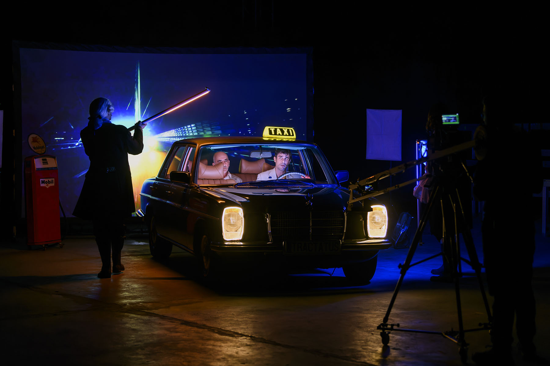 Many scenes are set in a car with live camera feeds to screen and projections. Christina worked closely with set designer Niki Psyhogiou – who also created the costumes – and camera operator Yorgos Kyvernitis, and chose Titan Tubes, this time running them wirelessly and applied in a more classically cinematic context as in-car fill and for key lighting of the protagonists.