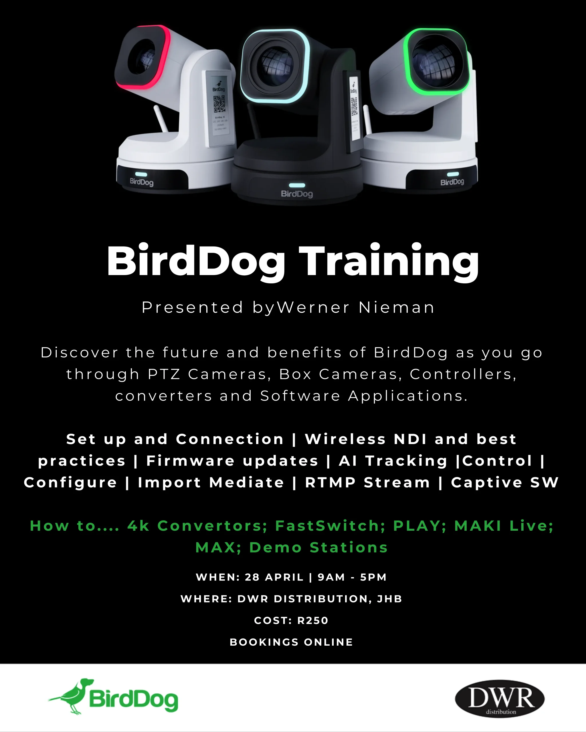 Discover the future and benefits of BirdDog as Werner Nieman walks you through PTZ Cameras, Box Cameras, Controllers, converters and Software Applications on 28 April from 9am to 5pm at DWR Distribution in Johannesburg.