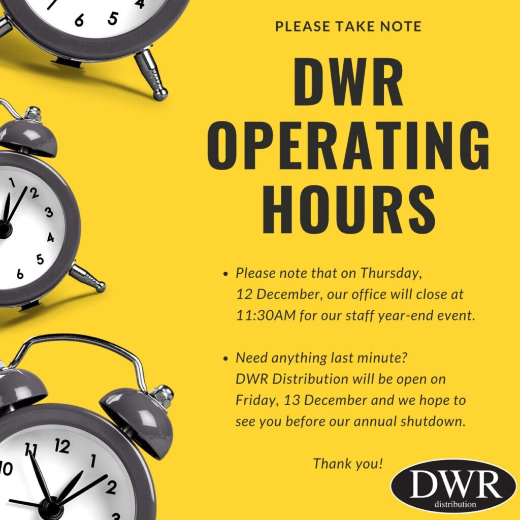 Just a quick note to let you know that on Thursday, 12 December, the DWR offices will be closing a little earlier at 11:30 AM for our staff year-end celebration.