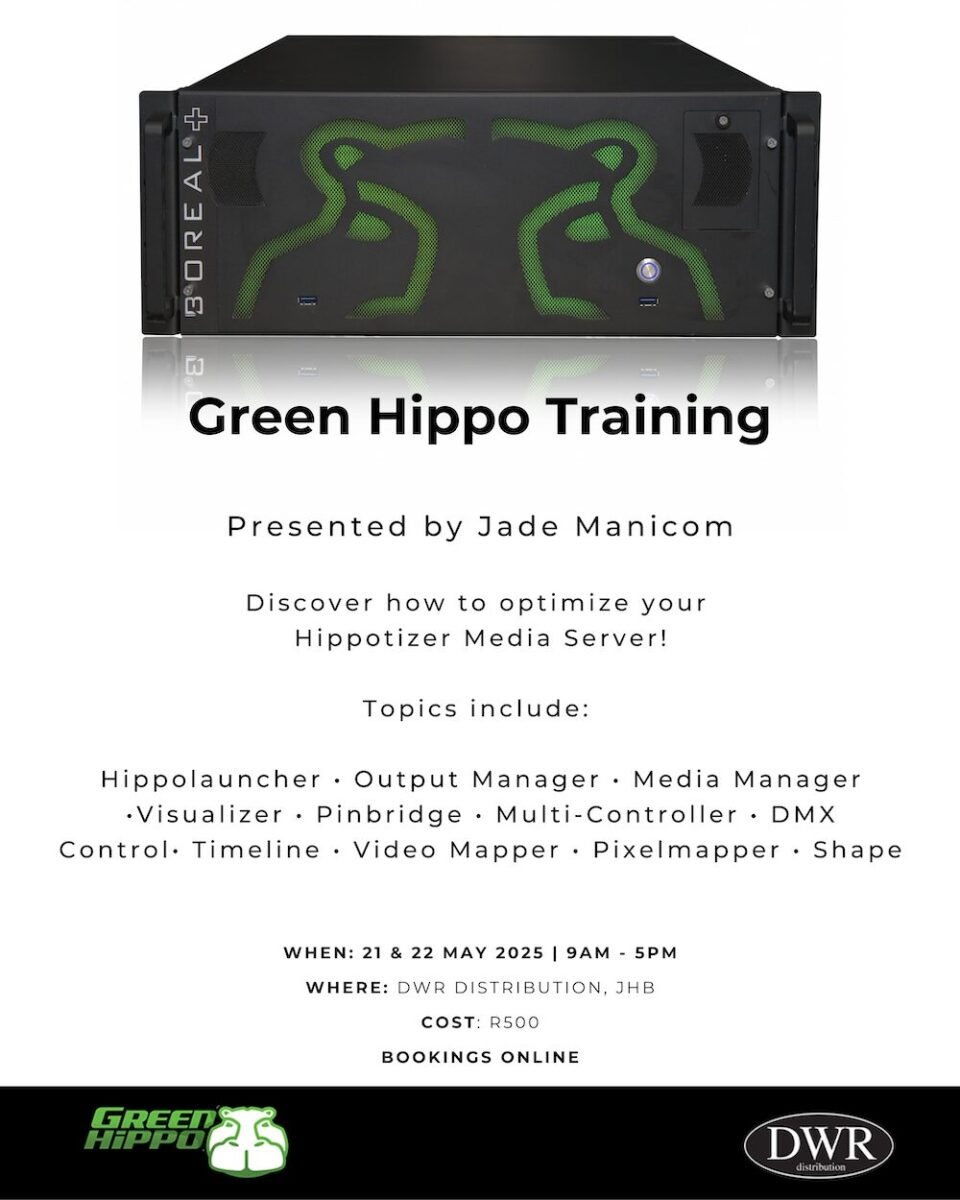 Join Jade Manicom for a two-day Green Hippo Training Session on 21 and 22 May at DWR Distribution in Johannesburg. Gain practical experience in operating, configuring, and optimizing your Hippotizer Media Server, with a focus on the v.4.8.4 software.