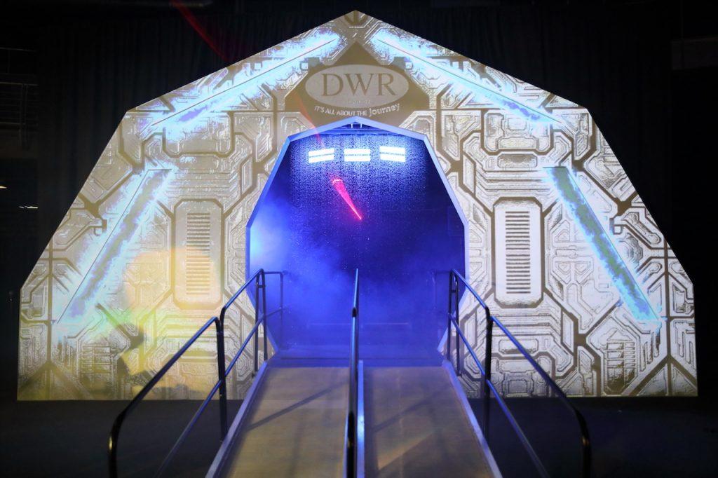 DWR’s initial concept was to create a small bus station at the expo where show goers could hop on board a bus and be transported to the DWR offices some six minutes away. As ideas darted back and forth around the boardroom table, it was DWR’s Gareth Chamber who announced, “Let’s have a Stargate portal,” the articulated words turning all former planning onto its head! The portal, that would end up taking close to 1 400 ‘explorers’ to a galaxy far, far way, was born! The show stopper saw guests at Mediatech enter through the portal’s water curtain, supplied by LazerX, and then walk along an exceptionally bright and blinding lit tunnel before embarking on a journey to DWR where the experience continued! (more on that at: https://dwrdistribution.co.za/jeffrey-rob-e-robot-takes-mediatech-storm)