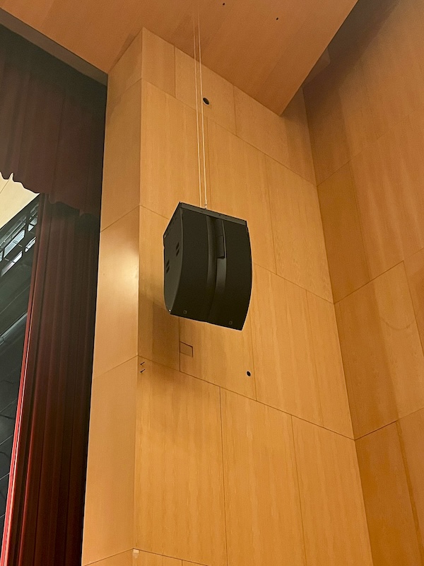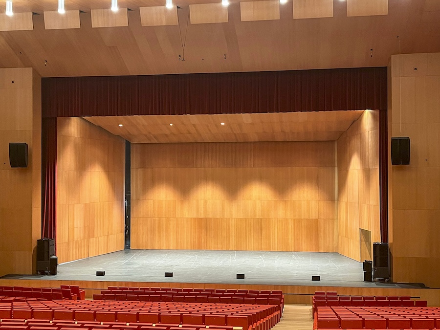 Teatro Baluarte’s 1,600-seat main auditorium presented a classic audio challenge: achieving consistent coverage across 40 metres of depth without delay systems, while accommodating programming that ranges from classical orchestras to contemporary rock concerts. The venue’s reverberant acoustics and requirement for clean stage presentation – essential for flamenco and classical performances – demanded a solution that could deliver professional touring-grade audio within strict aesthetic constraints.