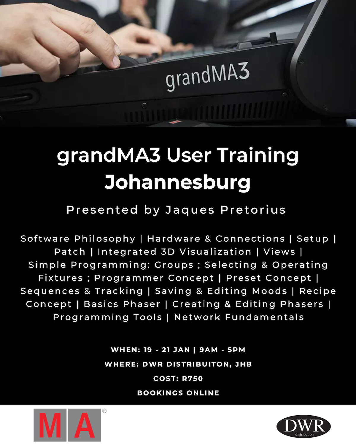 A three-day grandMA3 User Training workshop, presented by Jaques Pretorius, will be held at DWR Distribution, Cape Town, from 28 to 30 May from 9 am to 5 pm daily. This training course aims to familiarize the operator with the