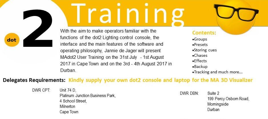 With the aim to make operators familiar with the functions of the dot2 lighting control console, the interface, main features of the software and operating philosophy, Jannie de Jager from DWR Distribution will be presenting dot2 User Training in