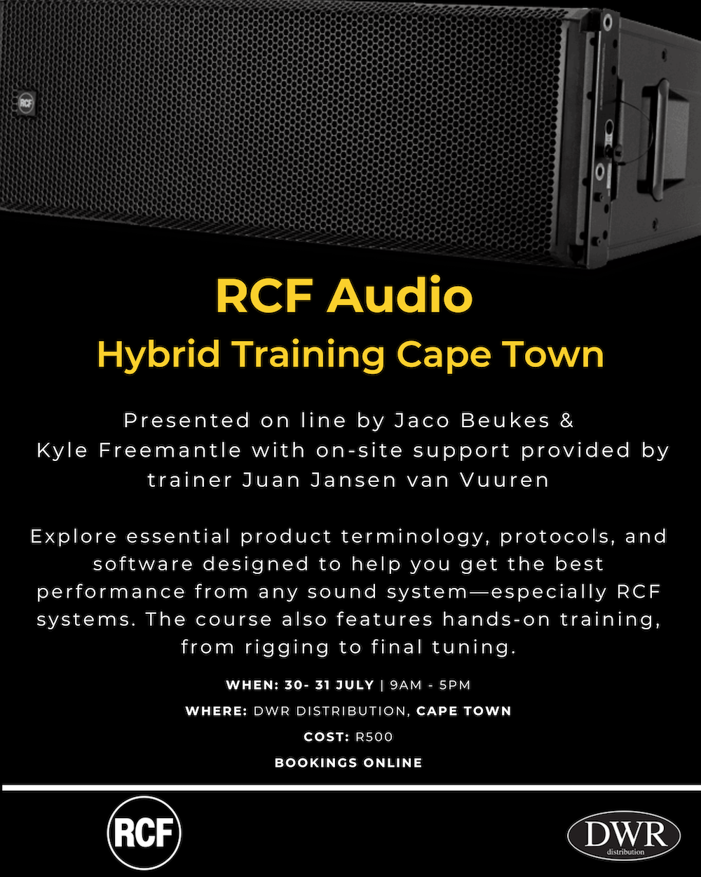 Cape Town technicians looking to enhance their audio skills are invited to join RCF Training held at DWR Distribution, Cape Town. The training, presented by Jaco Beukes and Kyle Freemantle, will be streamed live from Johannesburg, with on-site support provided by trainer Juan Jansen van Vuuren. The course runs on 30 and 31 July from 9am to 5pm, with theory covered on the first day and hands-on practical training on the second.
