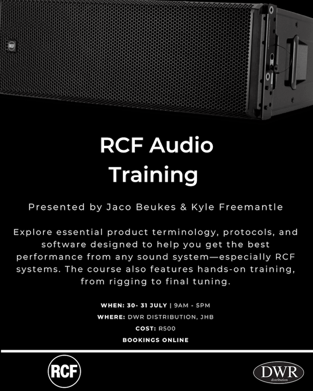 Enhance your audio skills with RCF Training, presented by Jaco Beukes and Kyle Freemantle at DWR Distribution, Johannesburg. The course takes place on 30 and 31 July from 9am to 5pm—starting with theory on day one and offering hands-on insight and training on day two.