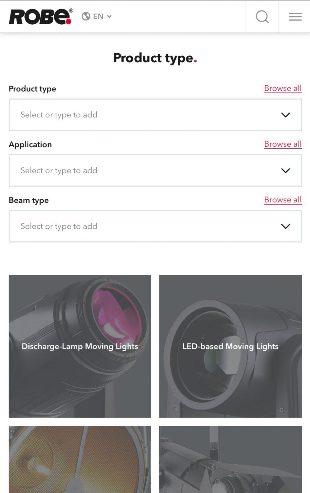 Regional variants of the website, e.g. for Germany, France, etc. will be supported by Robe’s subsidiaries, complete with translations, and these will additionally carry dedicated content and further helpful information refined and developed specifically for these markets.