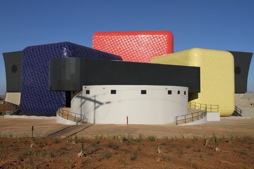 Soweto, South Africa – Sculptural and striking, the brand new Soweto Theatre is a bold, brightly coloured beacon to progress on the dusty red landscape of the Sowetan skyline. The first ever theatre to be built in the former township, it’s three primary coloured cuboid venues, curved buttress walls and tented entrance command attention from miles around.