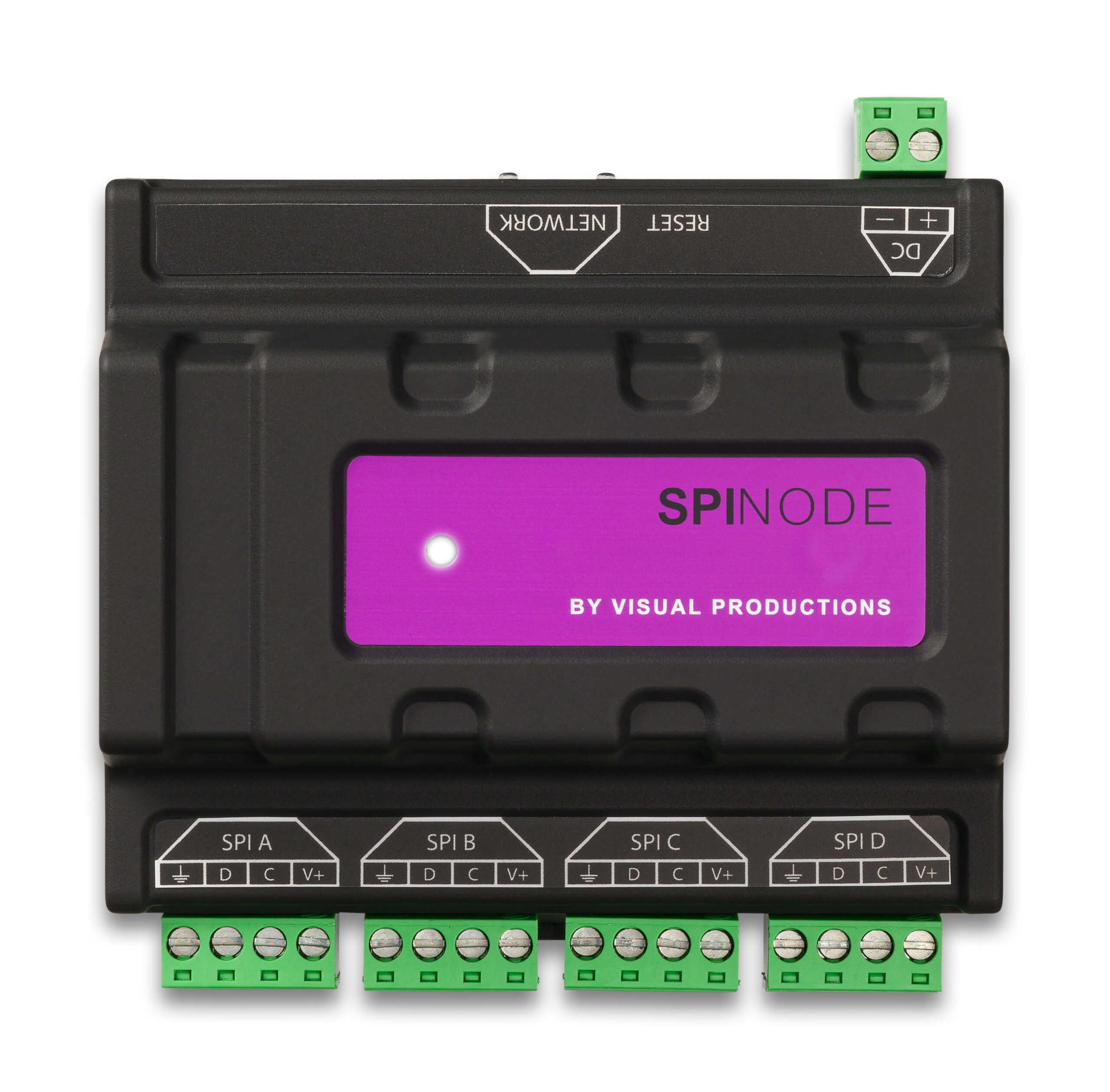 The SpiNode is a high-performance eDMX node purpose-built for LED pixel control. It translates Art-Net and sACN protocols into four independent SPI outputs, each capable of driving up to 1,024 pixels, with up to six DMX universes per port. Altogether, the SpiNode can handle 24 universes — making it a powerful and compact tool for pixel-mapped lighting control.