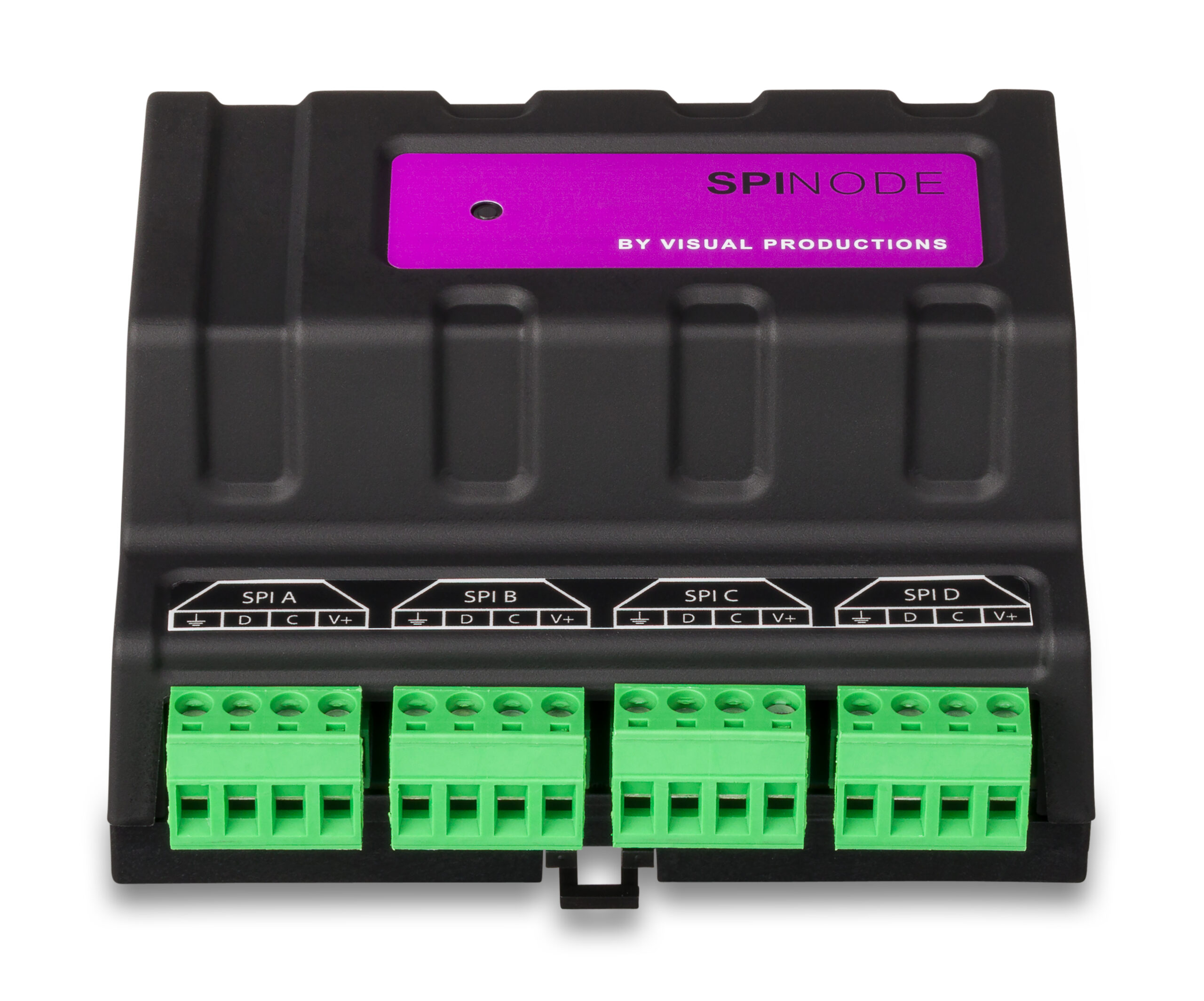 The SpiNode is a high-performance eDMX node purpose-built for LED pixel control. It translates Art-Net and sACN protocols into four independent SPI outputs, each capable of driving up to 1,024 pixels, with up to six DMX universes per port. Altogether, the SpiNode can handle 24 universes — making it a powerful and compact tool for pixel-mapped lighting control.