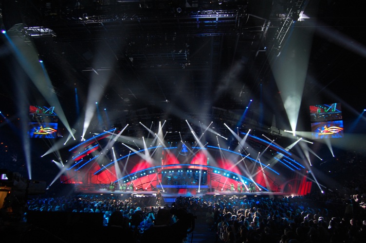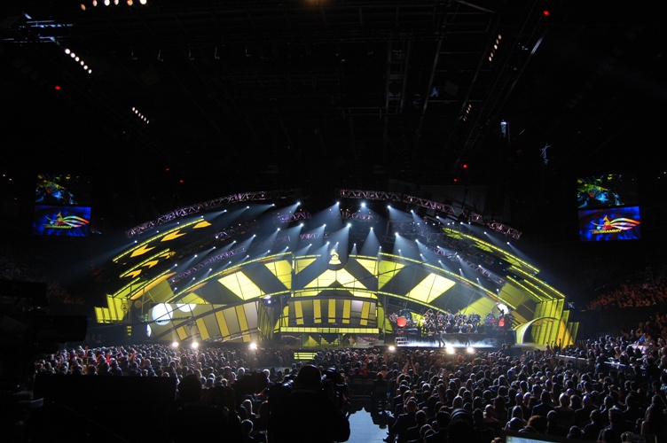 “This year, the set consisted of walls that were framed with LP screen material on all sides with a rounded back which shaped it into an oval. Our idea was to continue the set with the lighting, so we used three rounded main trusses over the top of the set to complete the oval shape and gives it a nice complementary dynamic look that worked on TV.”